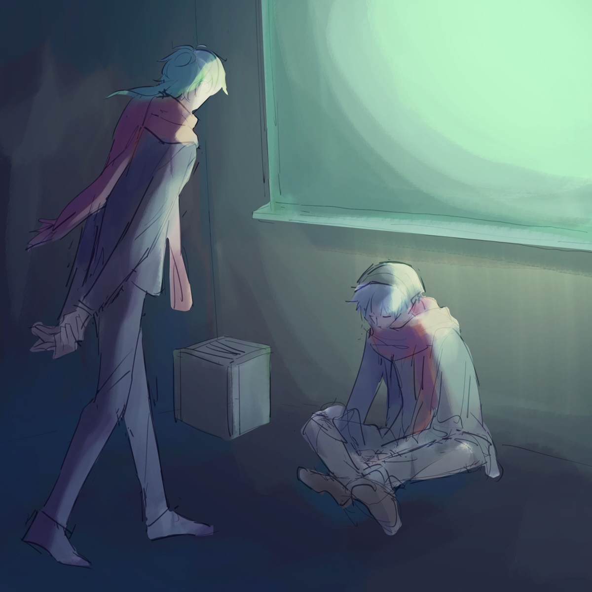 ・モニター奥のサラ→モニター手前のサラ?(白衣)とか夕焼けを映した瞳(→夕焼けが映る画面)とかそれとなく入れてみたり